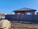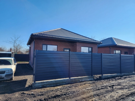 Красный кирпич «вишня» на белом шве, крыша и забор антрацит — единый стиль. Увеличенные окна с защитным напылением.